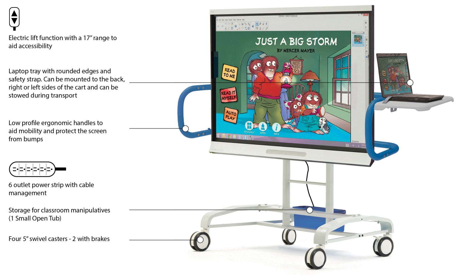 “We have been extremely satisfied with the quality of the iRover2 and the amazing support we have received from Copernicus. The assembly and setup of the carts are very easy. The reaction from teachers has been very positive, they love the motorized lift and the small size of the unit. iRover2s are in use in our classrooms on a daily basis and have withstood the rigors of student use. After evaluating a number of different carts, we decided to stay with Copernicus. It has become the only cart schools are allowed to purchase for their SMART Boards."