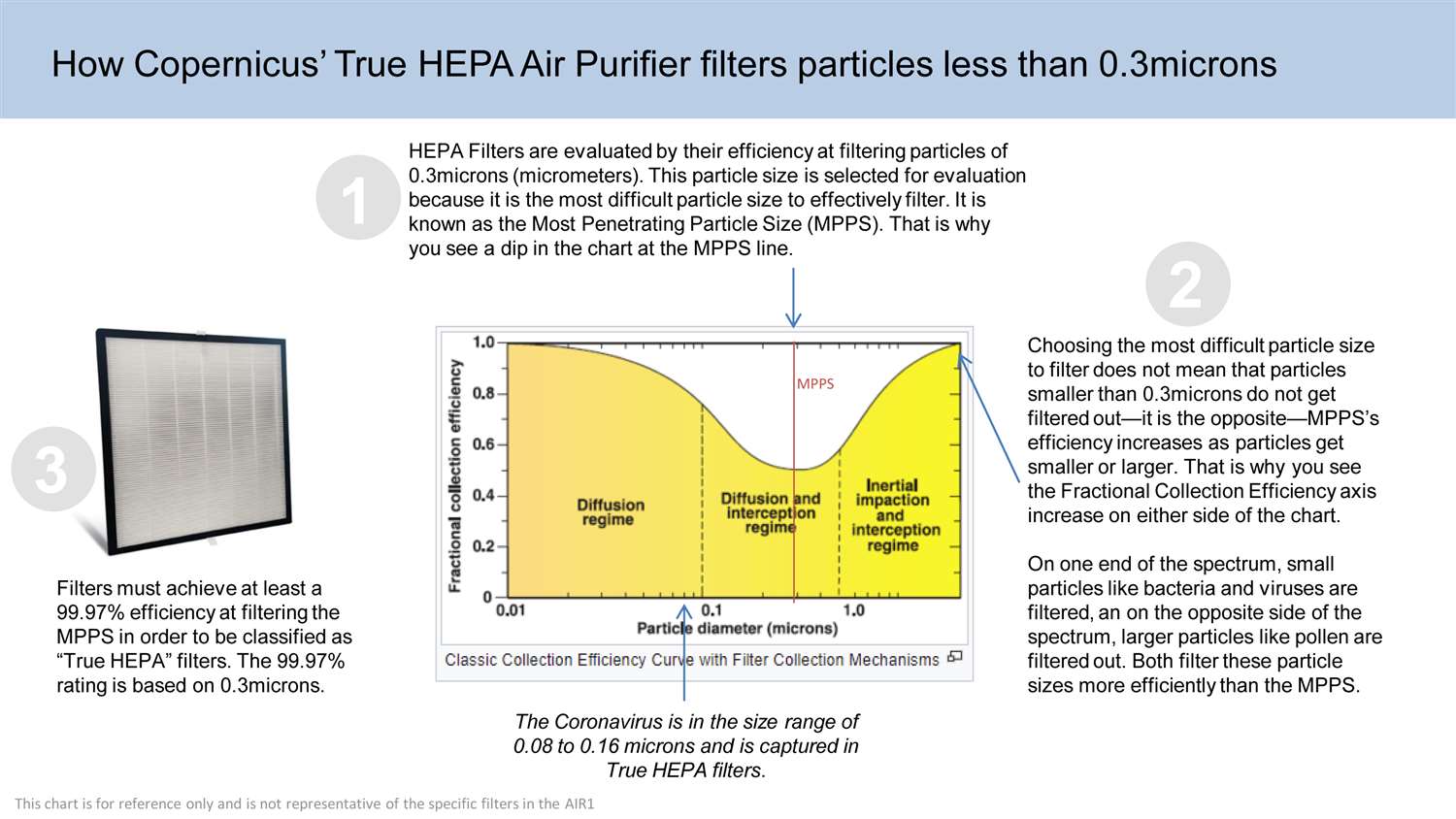 *99.97% is the filtering efficiency measured with the worst-case particle size of 0.3microns (the standard for most penetrating particle size or MPPS). Particles that are smaller than 0.3microns and larger than 0.3microns will be filtered at an efficiency equal to or greater than 99.97%. Learn more about how HEPA filters capture particles. Visit the United States Environmental Protection Agency (EPA) website