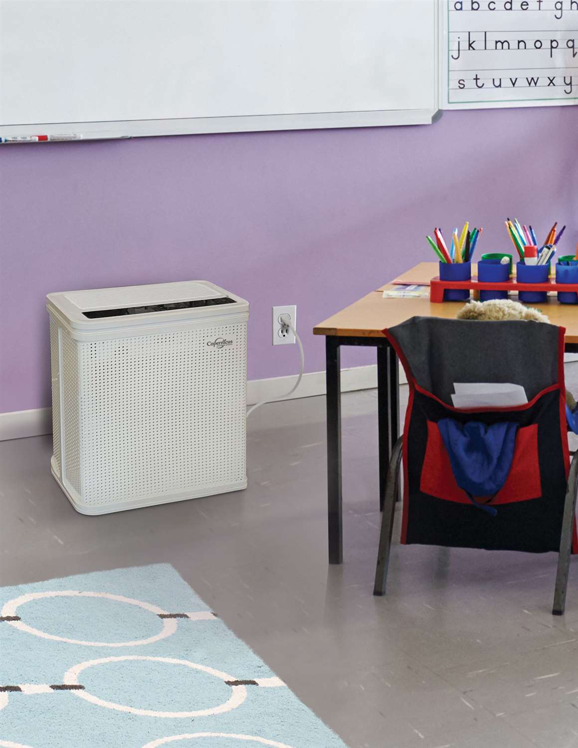 *The Portable True HEPA Air Purifier is designed for an average classroom that is 750 sq ft, with ceilings at 8 ft height. Fan speed, ceiling height, age of HVAC and other ventilation are all variables that affect total air changes per hour (ACH). To achieve optimum air purification for your room size, please contact your Copernicus representative to calculate the right number of units for your space. You will need to provide the room size and ceiling height.