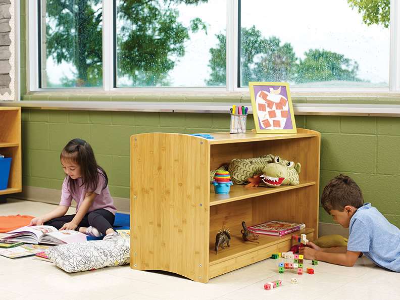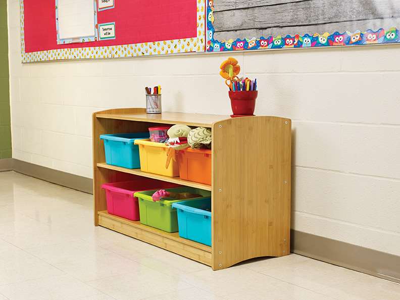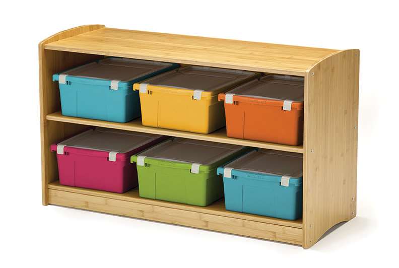 Bamboo is a renewable resource that grows quickly and sequesters carbon, unlike steel which produces carbon. The Bamboo Shelving Unit has a natural aesthetic suited for neutral and early childhood environments. With 2 shelves for storage and an included 6 tubs, this Bamboo Shelving Unit is at the ideal height for early childhood students and educators to access toys, books, and other supplies.