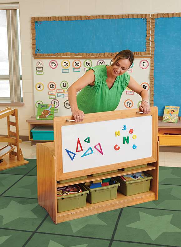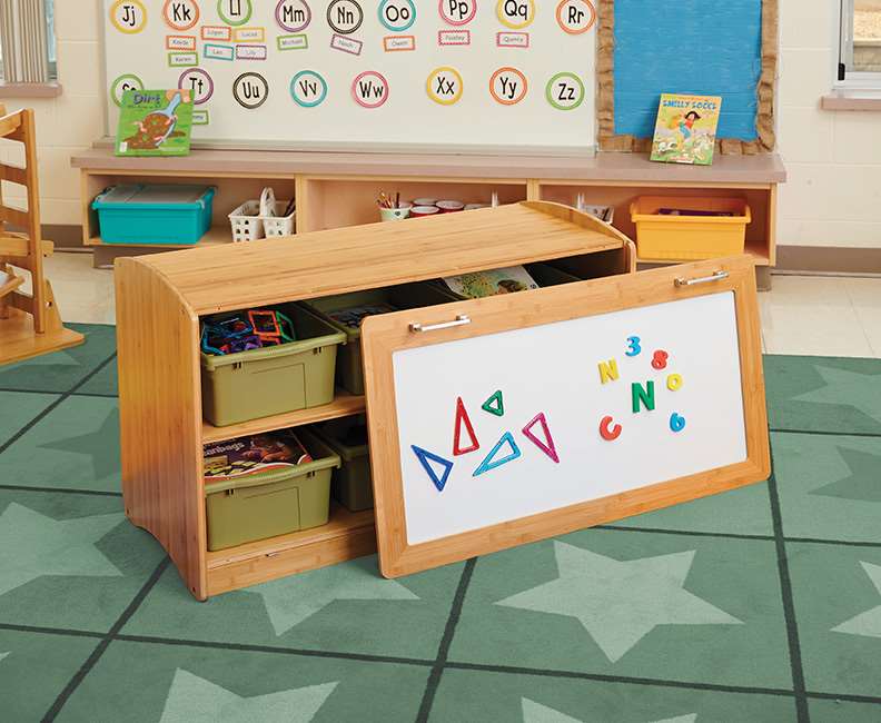 The Hide-away Shelf has a natural aesthetic suited for neutral and early childhood environments. This shelf is both a storage and activity center. The top shelf is at a height that is easily accessible to early childhood students to play, and the two shelves below plus an included 6 Large Open Tubs, offer storage for other classroom supplies and toys. The Hide-away panel is not only a magnetic whiteboard, but it functions as a cover to allow educators to display certain toys and supplies and hide when needed. The Hide-away Panel can be stored and used on the back of the shelf when not in use on the front.