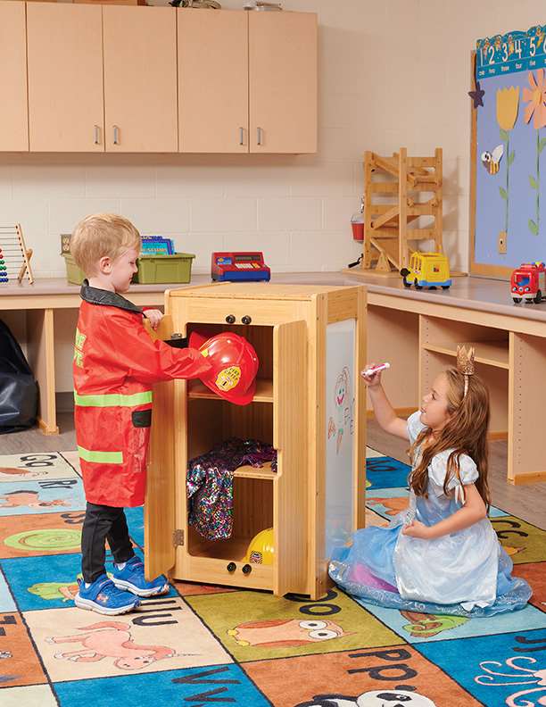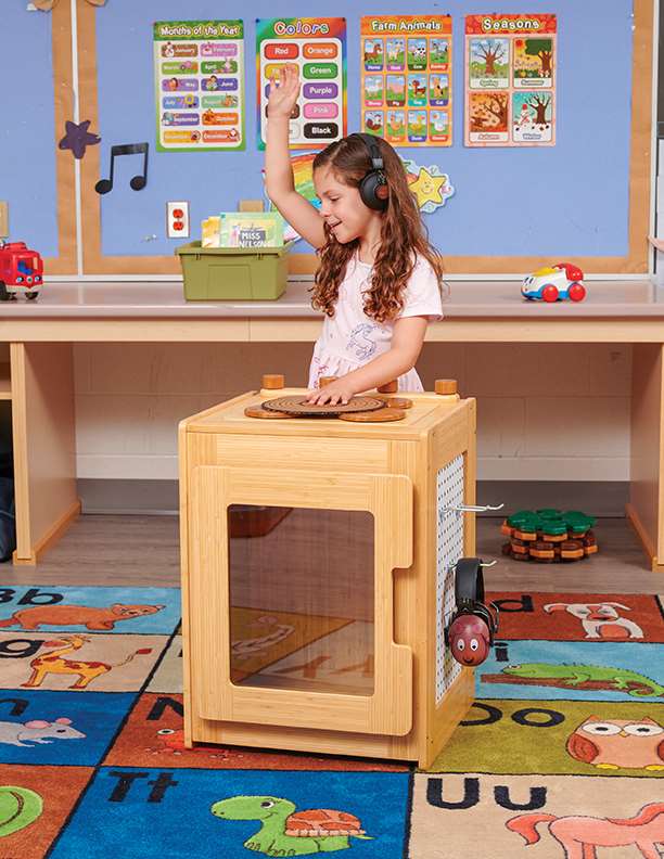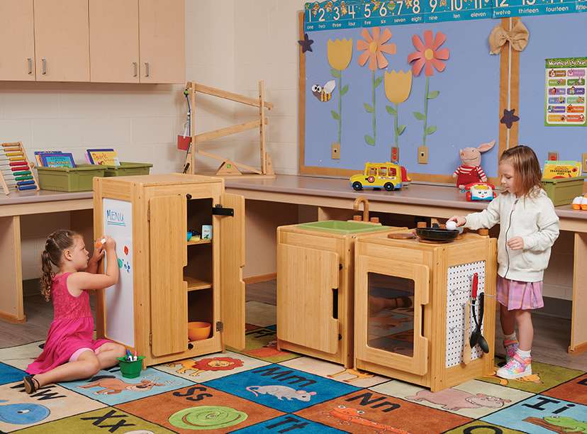 This bamboo Make-Believe Kitchen set includes a sink, stove, and fridge featuring magnetic whiteboards, pegboards, shelving, knobs, and dials to add emergent literacy and imaginative play opportunities. Is it a kitchen set, a loose parts play station, or a space shuttle command center? Let little imaginations decide! The fridge, stove, and sink can also be purchased as standalone items.