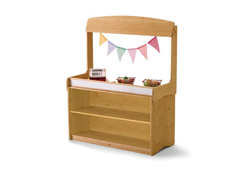 This bamboo Make-Believe Stand includes a magnetic whiteboard, and holes at the top of the stand to add a DIY curtain rod or other hanging decor. Designed to add emergent literacy and imaginative play opportunities, the Make-Believe Stand can be a puppet theatre, a market stand, a school bus, or whatever little imaginations decide!