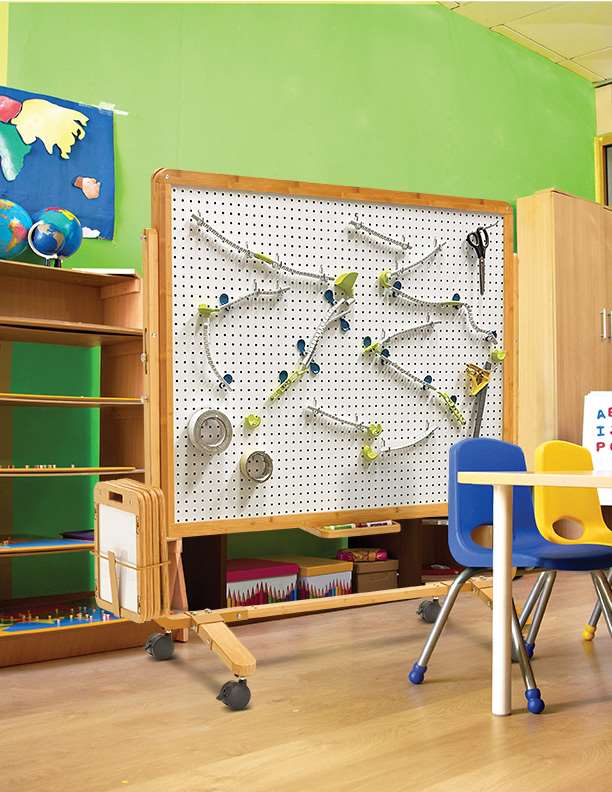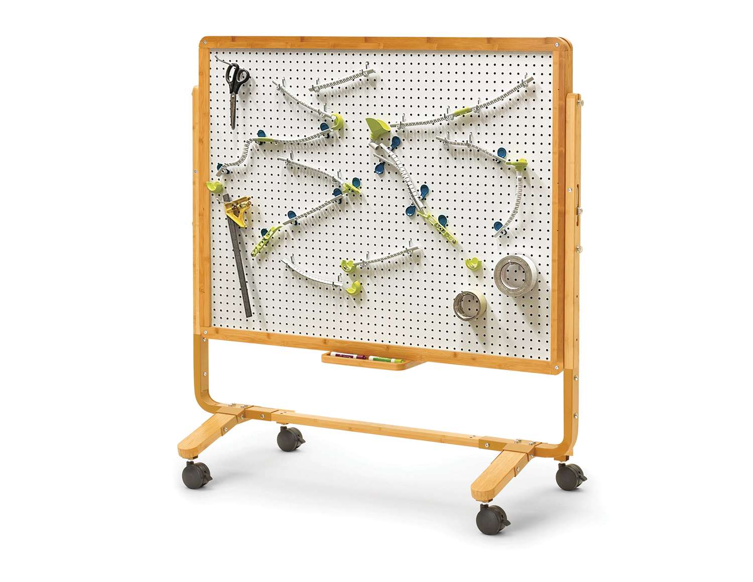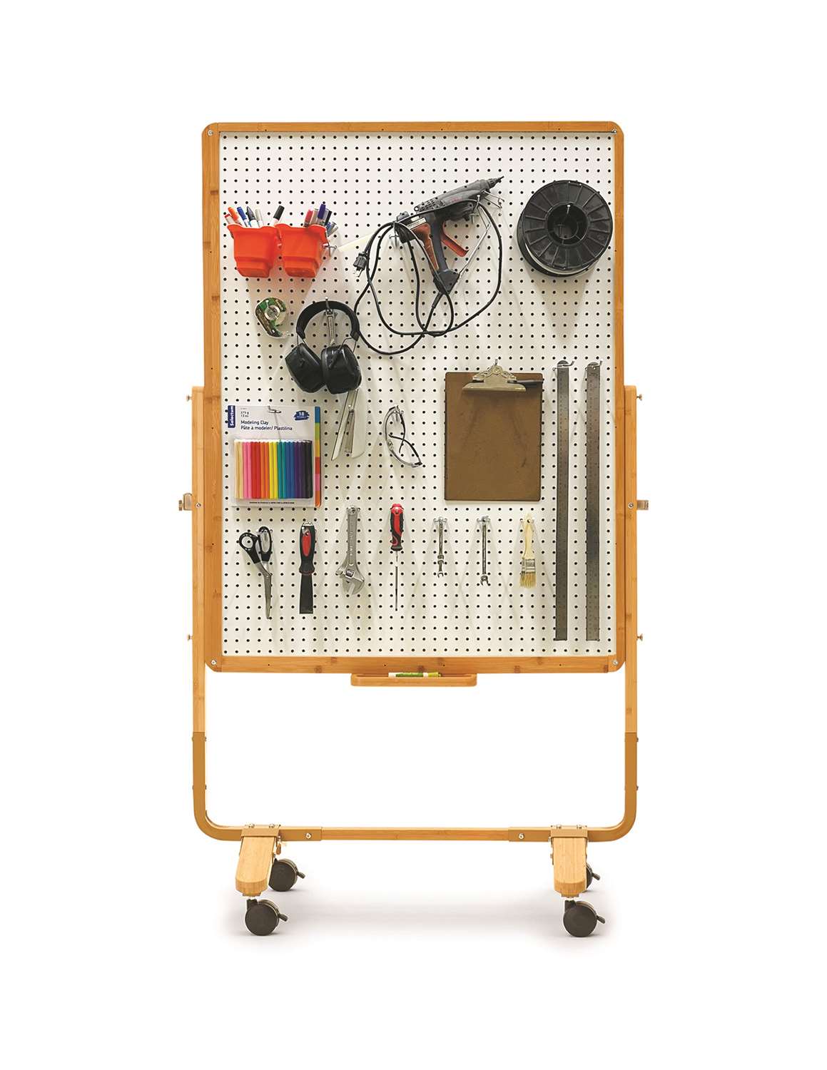Bring ideas together with the Collaboration Center. This new bamboo Collaboration Center offers plenty of space for STEM equipment. With a large 4’ x 3’ pegboard on one side and a magnetic whiteboard on the other, the easel can be positioned in either vertical or horizontal formats and different height setups. The Collaboration Whiteboard is a flexible solution for lessons and activities. Also included are 20 hooks to store activities, supplies, or learning materials. Multiple Collaboration Centers can connect to form partitions in common areas.