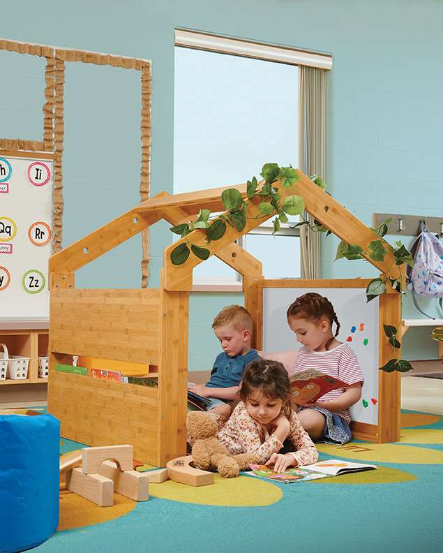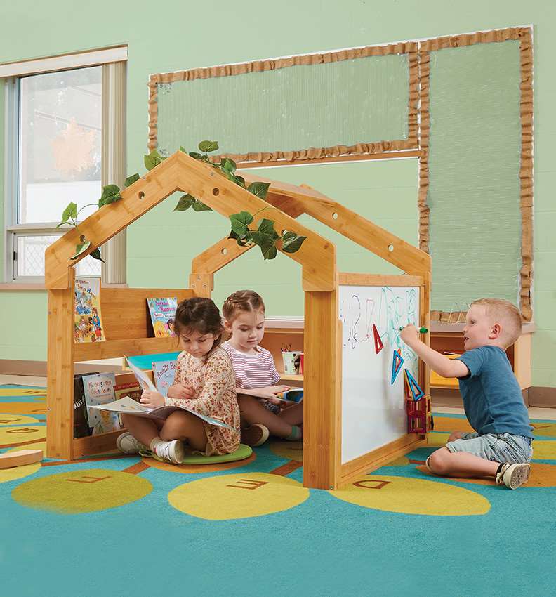 This Cozy Space features bamboo construction with an interior bookshelf, a removable double-sided magnetic whiteboard, and a place to attach a blanket or lights to suit any child's imagination. It offers a calm area in a classroom while allowing viewing area of the students inside.
