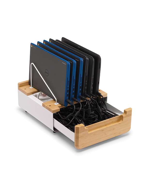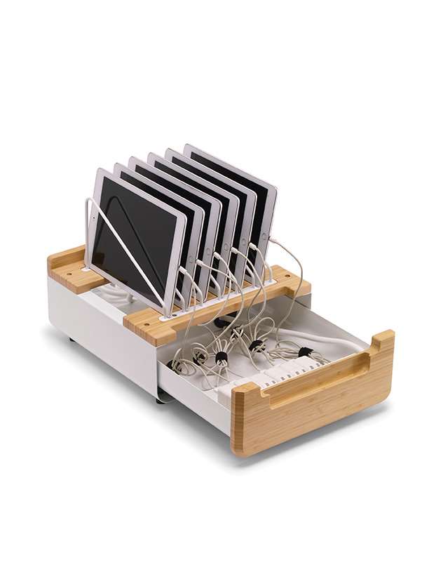 The Device Management Stand offers a solution for charging and simple cable management. This unit features bamboo elements, to offer a modern look and a lower environmental impact. With storage for 6 devices, the Device Management Stand allows for easy access to adapters via the pull-out drawer while maintaining clean and organized cable management with cord management slots.