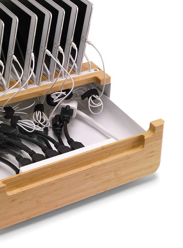 The Device Management Stand offers a solution for charging and simple cable management. This unit features bamboo elements, to offer a modern look and a lower environmental impact. With storage for 10 devices, the Device Management Stand allows for easy access to adapters via the pull-out drawer while maintaining clean and organized cable management with cord management slots.