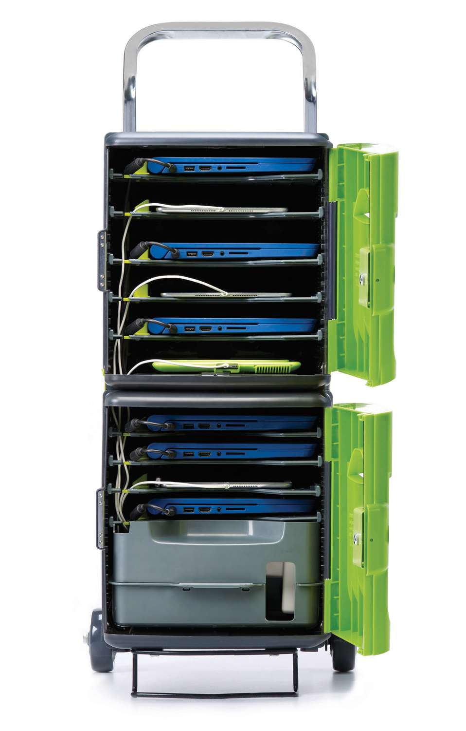 Trolleys are designed for devices on the move! They store up to 10 iPads. The adjustable handle and built-in casters ensure that students from grade three and up can take part in managing their devices. The Tech Tubs® can also be placed around the classroom to reduce deployment bottlenecks.