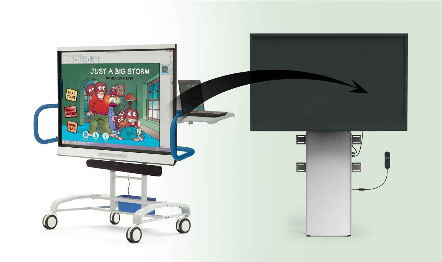 Educators can get more out of their initial iRover2 investment while reducing waste. Those schools with an existing iRover2 Cart for Interactive Flat Panels (IFP500) whose needs have changed can now mount their interactive flat panel onto a wood stud or masonry wall with this complete, easy-to-use conversion kit that re-uses parts from their iRover2 cart while keeping its height-adjustable function. Cords and support legs are concealed with a frame cover.