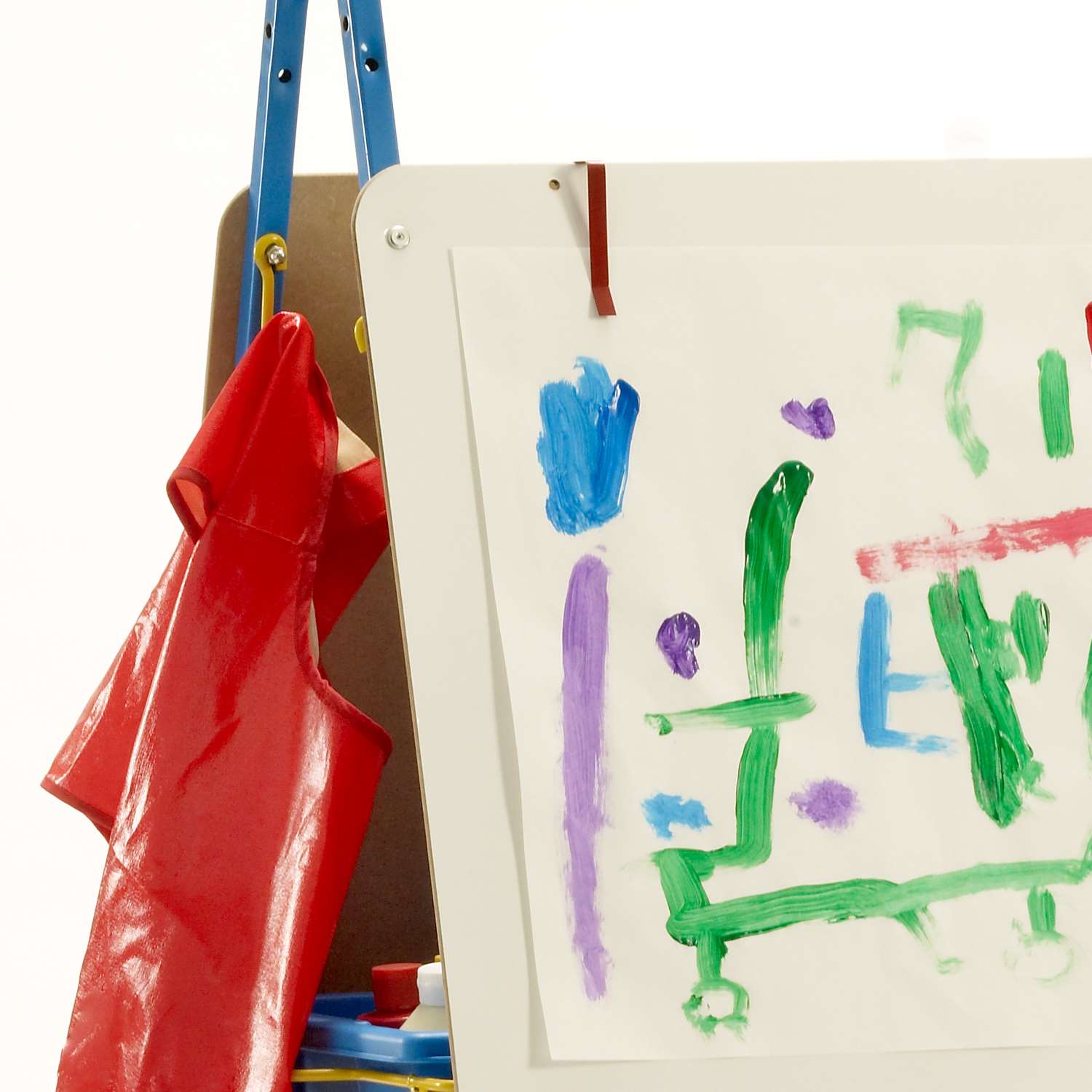 The Double Sided Art Easel is great because everything is at the student’s level so they can be completely independent from start to finish. It is great for fine motor skills with the clips and containers.