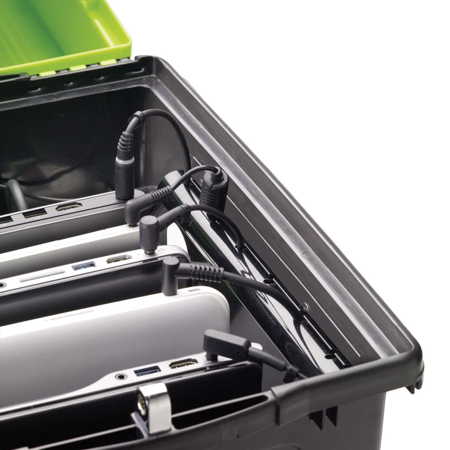 This Original Tech Tub® has the capability to charge up to 6 Chromebooks™, iPads® or other tablets. It makes sharing small sets of devices easy within a classroom or throughout a school. Adjustable dividers can accommodate most cases and the side cable management channel helps keep cords neat, tidy and lined up with each device.